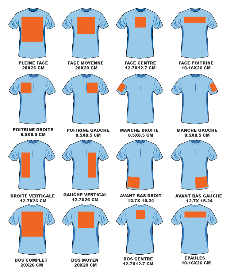 5 Impressions ( Exemple : ) Format Pleine Face ,Dos Complet, Poitrine Gauche, Poitrine Droite et Manche .Sans Textile.